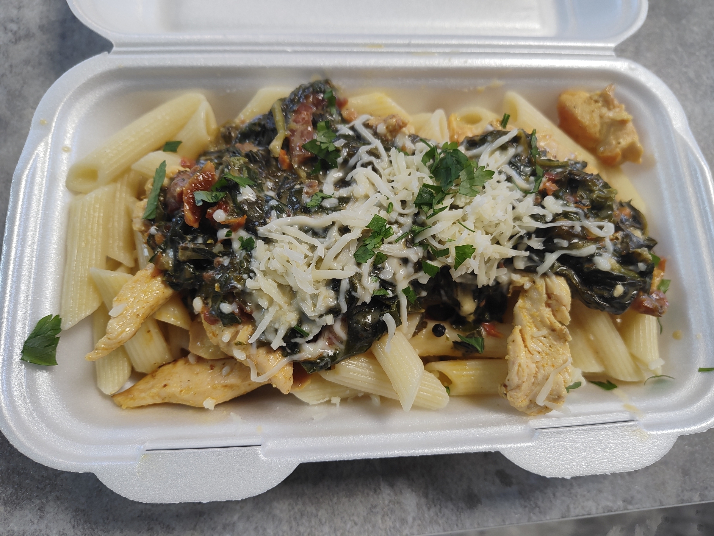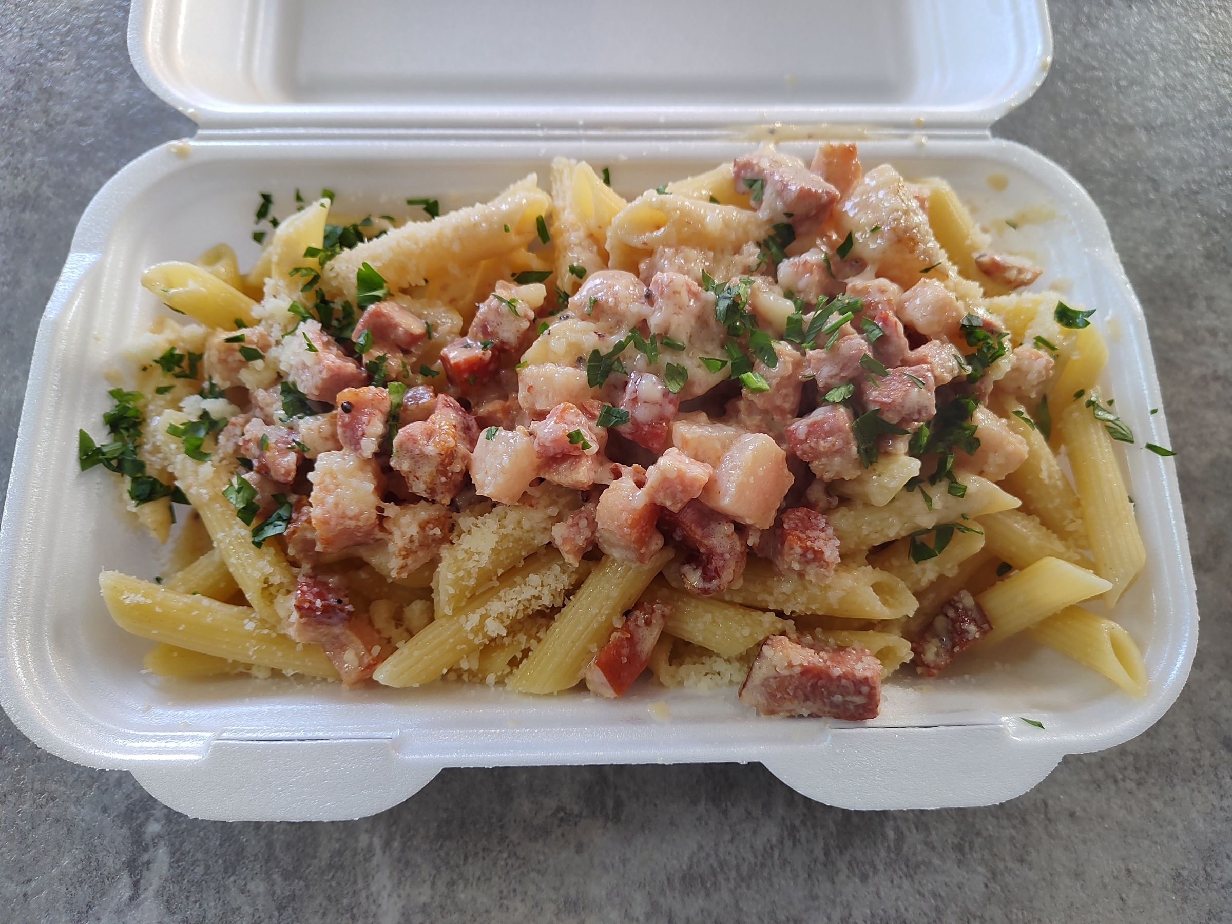 II DANIE- Makaron carbonara z boczkiem w sosie śmietankowym i posypce z sera żółtego