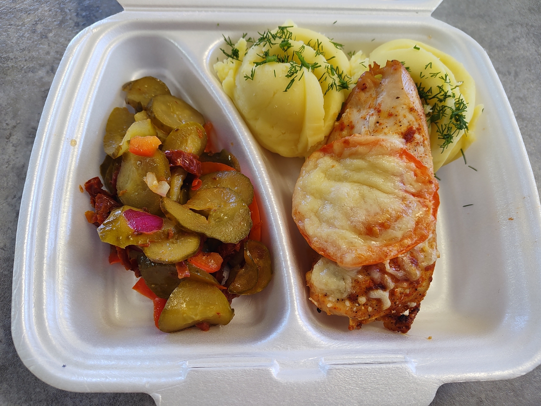 II DANIE- Filet zapiekany z serem żółtym i pomidorem, gotowanymi ziemniakami i surówką