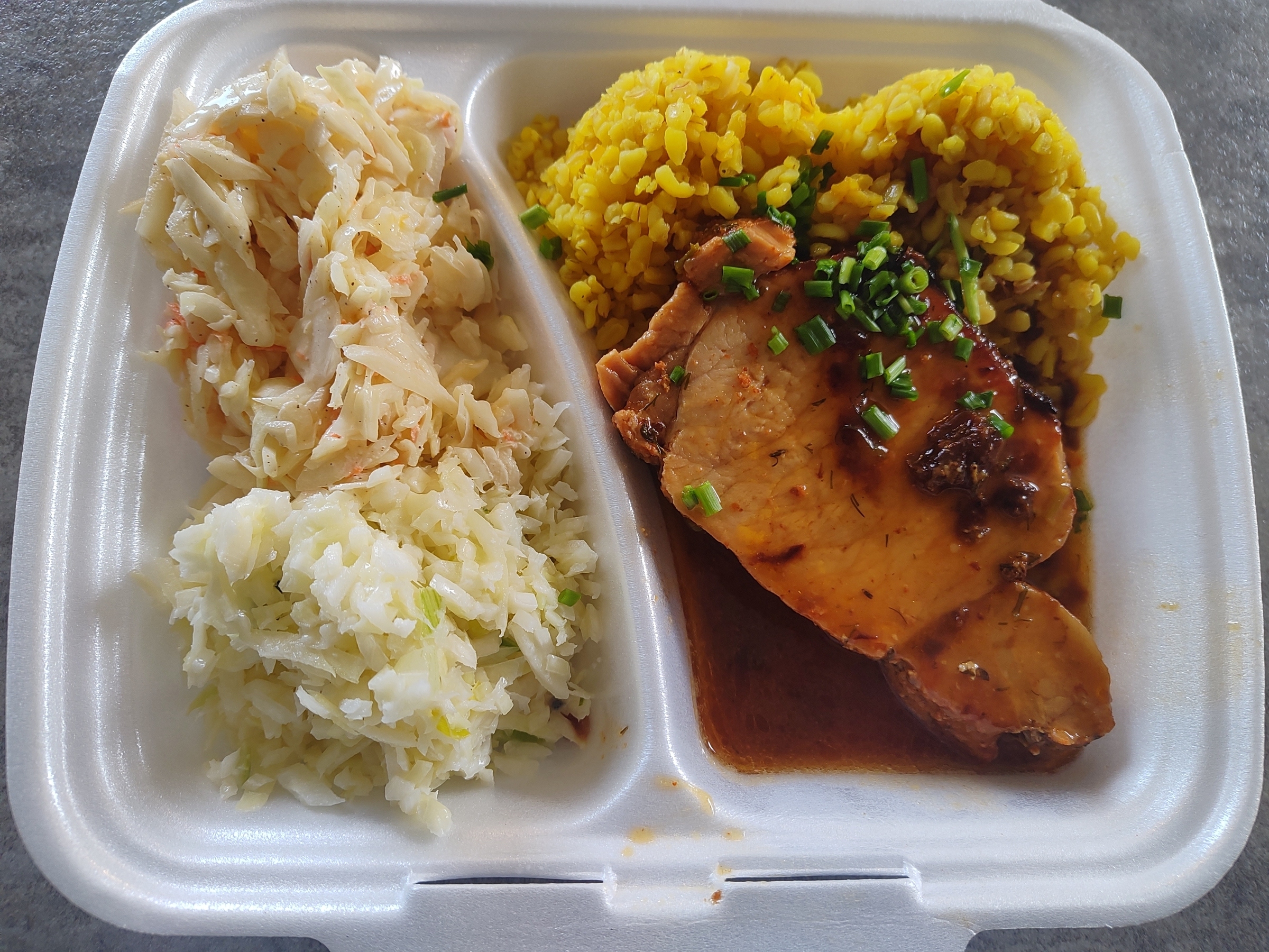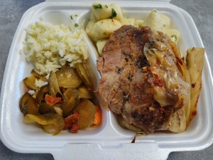 II DANIE- Schab pieczony z sosem, kaszą bulgur i zestawem surówek